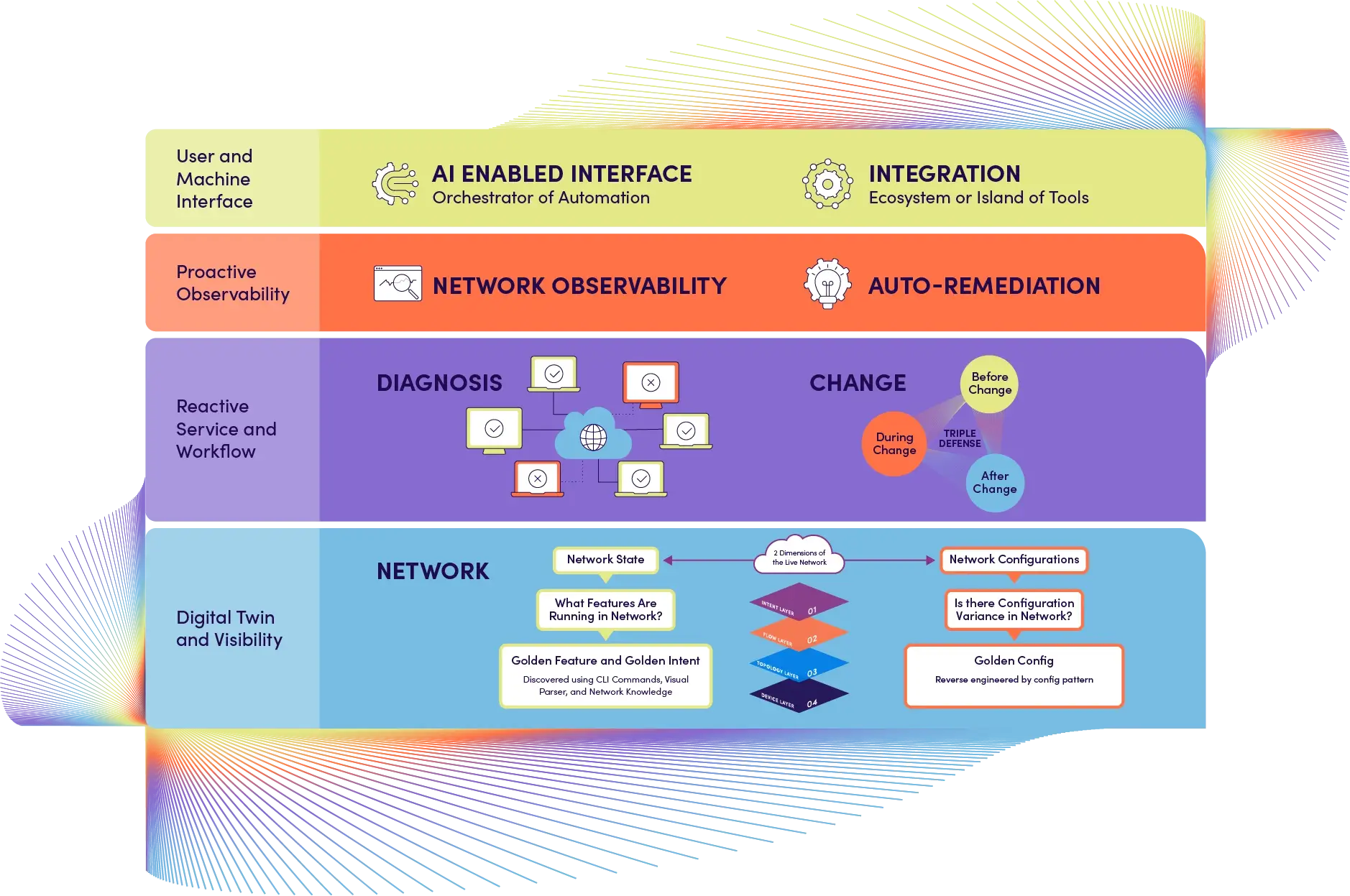 - Captures subject matter expertise through no-code to create desired network behaviors, replicate behaviors across the network, and then leverage that knowledge before, during, and after issues are detected